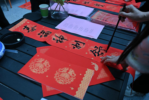 壓紙、蘸墨、揮筆、走字……在鼎盛美寓和開元美寓的共享空間里,書法家們揮毫潑墨、筆走龍蛇,一個個寓意吉祥的“福”字、一副副飽含美好祝福的春聯紛紛呈現在大家眼前,為即將到來的蛇年春節增添了濃濃的喜慶氛圍。